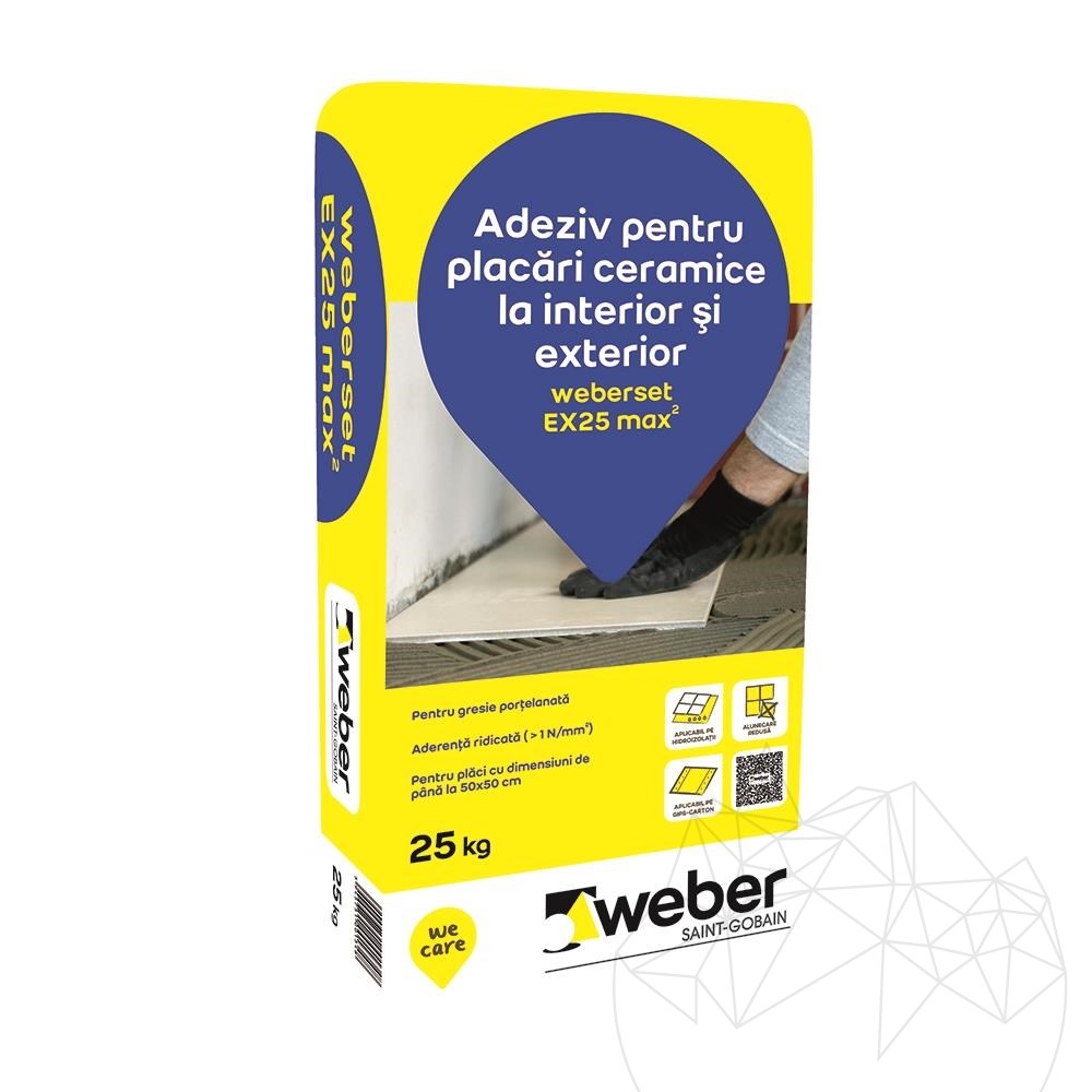 Pour the contents of a bag into approx. 6 - 6.5 liters of clean, cold water and mix with an electric mixer until a homogeneous mixture is obtained, without agglomeration. Leave it like this for approx. 5 minutes, then mix again. The resulting adhesive mortar is applied on the underlay using a grooved trowel. If the support is uneven, the adhesive will be applied to both the underlay and the tile. Tiles are attached to the contact surface by hand pressing, moving them onto the adhesive layer (if necessary using a rubber mallet) until a flat surface is obtained. Tiles should be laid in the adhesive layer within open time (before the crust forms on the surface of the adhesive). For ensuring a suitable contact surface, the adhesive must cover at least 65% of the back of tile for interior cladding and 100% for exterior cladding. The joints will be grouted after minimum 24 hours, using the Weber.color grout range.