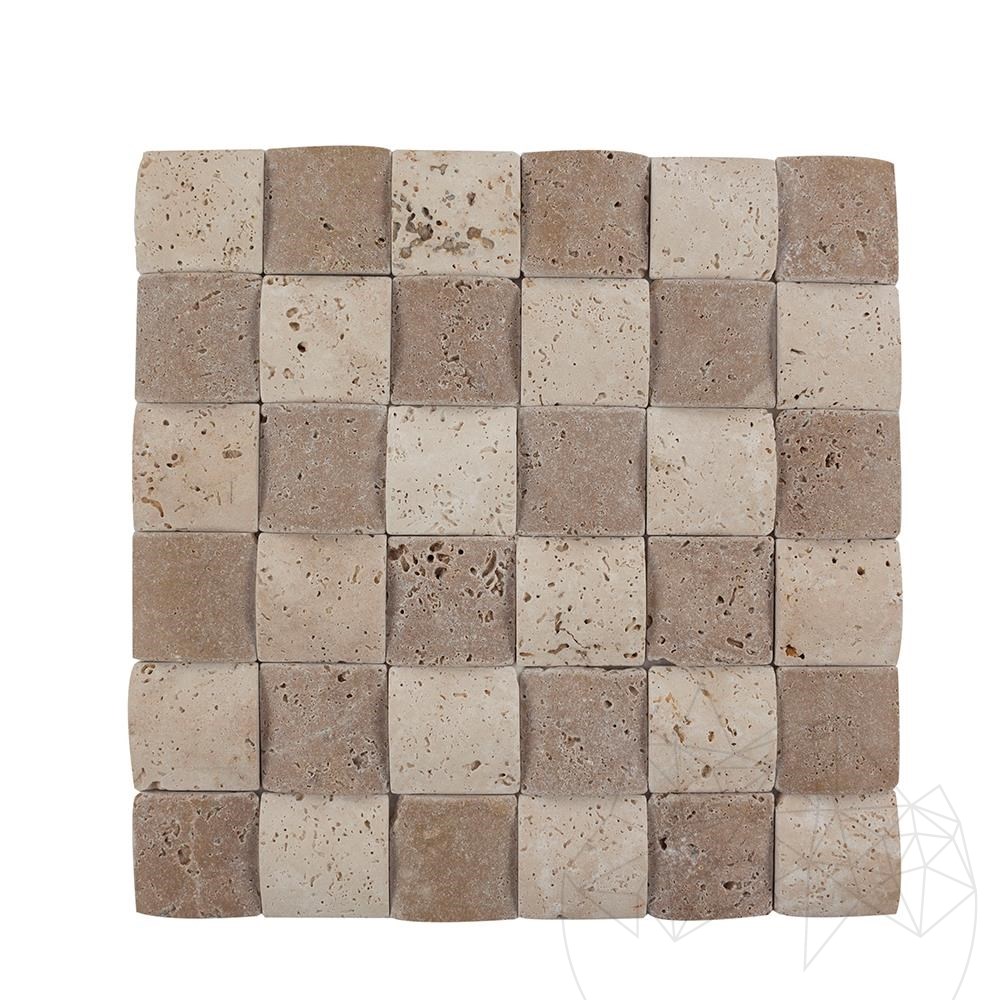 This mosaic made of both Noce 3D Pillow and Classic tumbled travertine is a very special product, fact which you can easily notice at first glance. The 3D effect of interleaved cream and chocolate colored tiles is highlighted in a discreet way specific to high end products. In interior designs, these cleverly mixed natural stones can be used in bathrooms, kitchens, living rooms, clubs or restaurants, the cladding of walls, fireplaces, decorative frames and so on. At the exterior, the mosaic works perfectly in covering facades, pillars and home bases. Its splitface finish and warm colors place this tumbled mosaic in a select group of ornaments used in Mediterranean, rustic, eclectic or even retro designs.