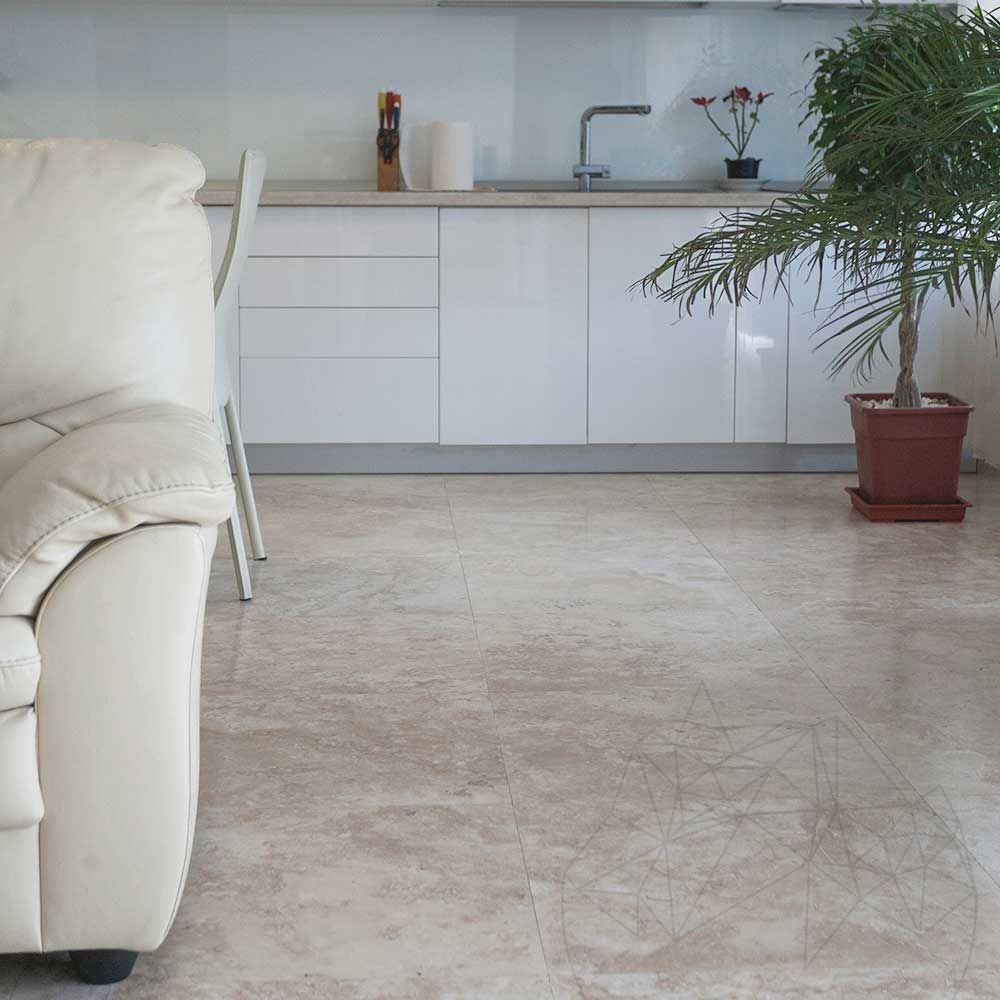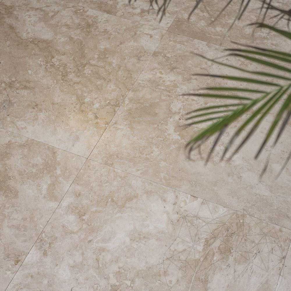 A large Classic PREMIUM travertine tile, suitable for generously sized spaces, which emphasizes the relaxing setting with its colors and feeling of continuity. A matte finish provides the travertine with a smooth surface and emphasizes its texture and color. Another advantage of using this type of tile is its fast installation, as the large sized tile will require fewer joints.