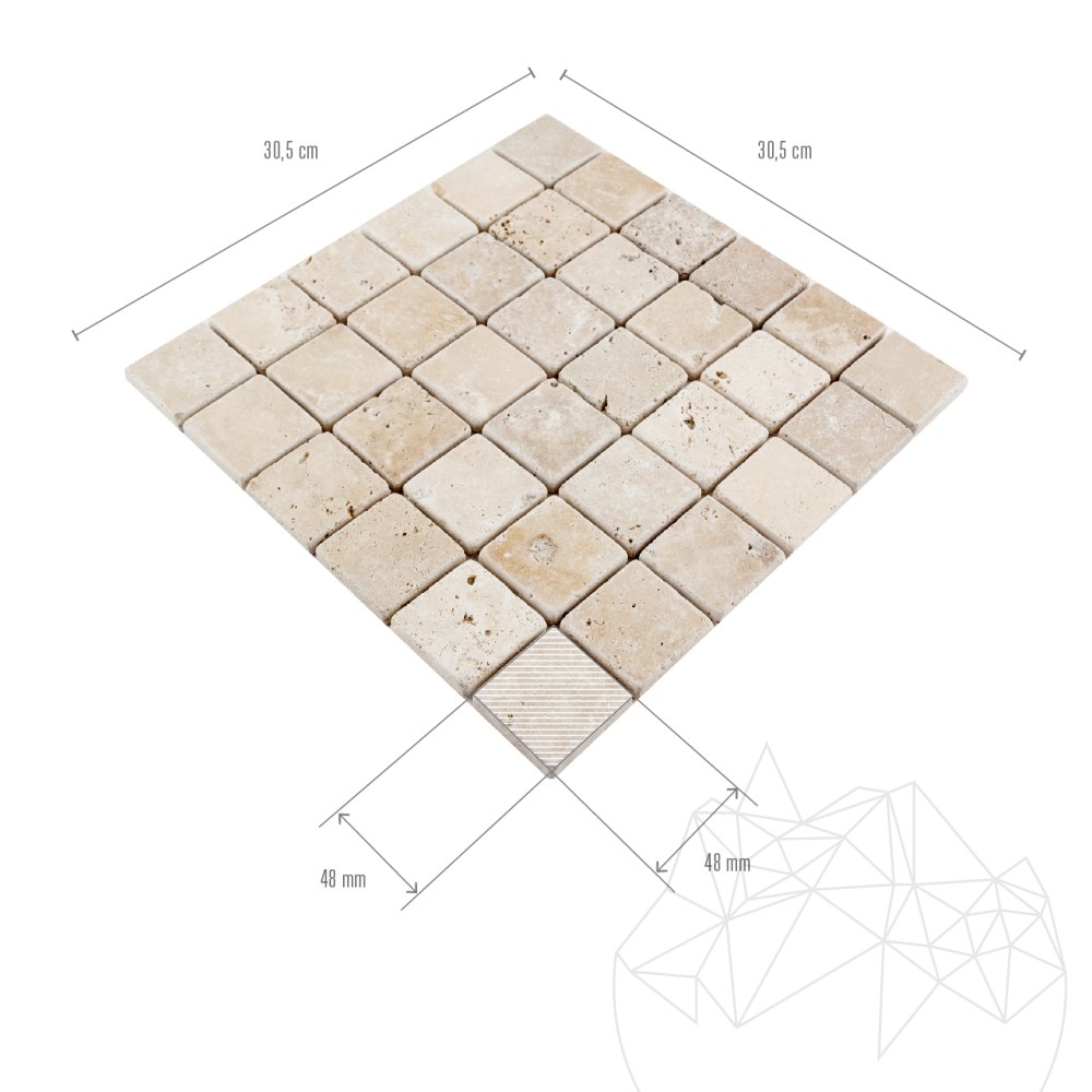 Check out our new offer for the Classic mosaic made of 4.8 x 4.8 cm travertine tiles with a splitface finish.