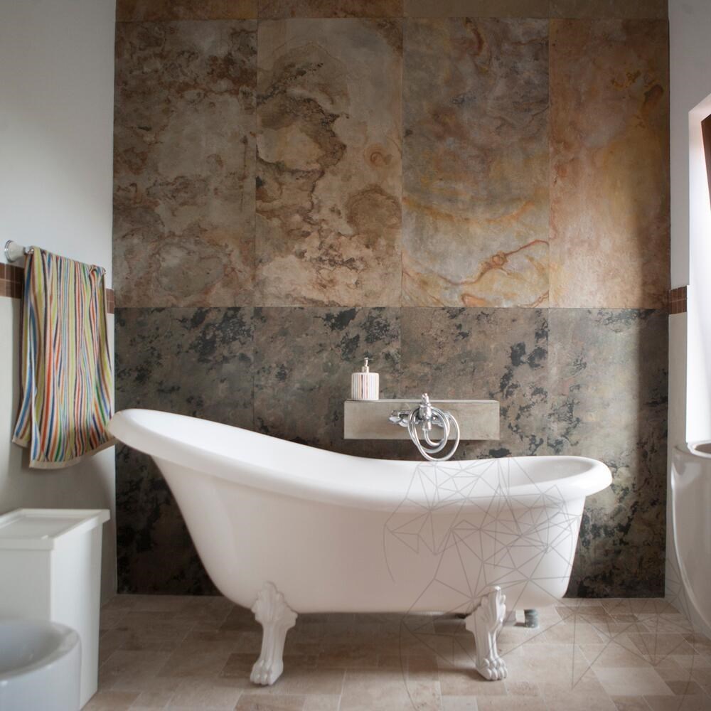 Is there such a thing as a natural stone wallpaper? Yes there is and it gives exterior and interior decorations a fabulous feeling. Produced using German technology, the SKIN-Indian Autumn 185 x 61 cm flexible slate veneer, with its brassy colors and autumn feeling, easily combines the minimalist look with the traditional one. With thickness of 1,5-3 mm (1-2 kg / sqm), this product can be used in different shapes with various materials. With no additional reinforcements required, this "stone wallpaper" is ideal for exterior claddings of facades of shopping centers, vacation homes, fences etc. You'll also be amazed by interior claddings in areas such as living rooms, kitchens, restaurants, saunas, even cellars. Being very malleable, it can also "help" furniture parts (doors, cabinets, tables, etc.). At an attractive price, the SKIN - Indian Autumn flexible slate veneer is easily installed using a simple adhesive, with no special reinforcements required.