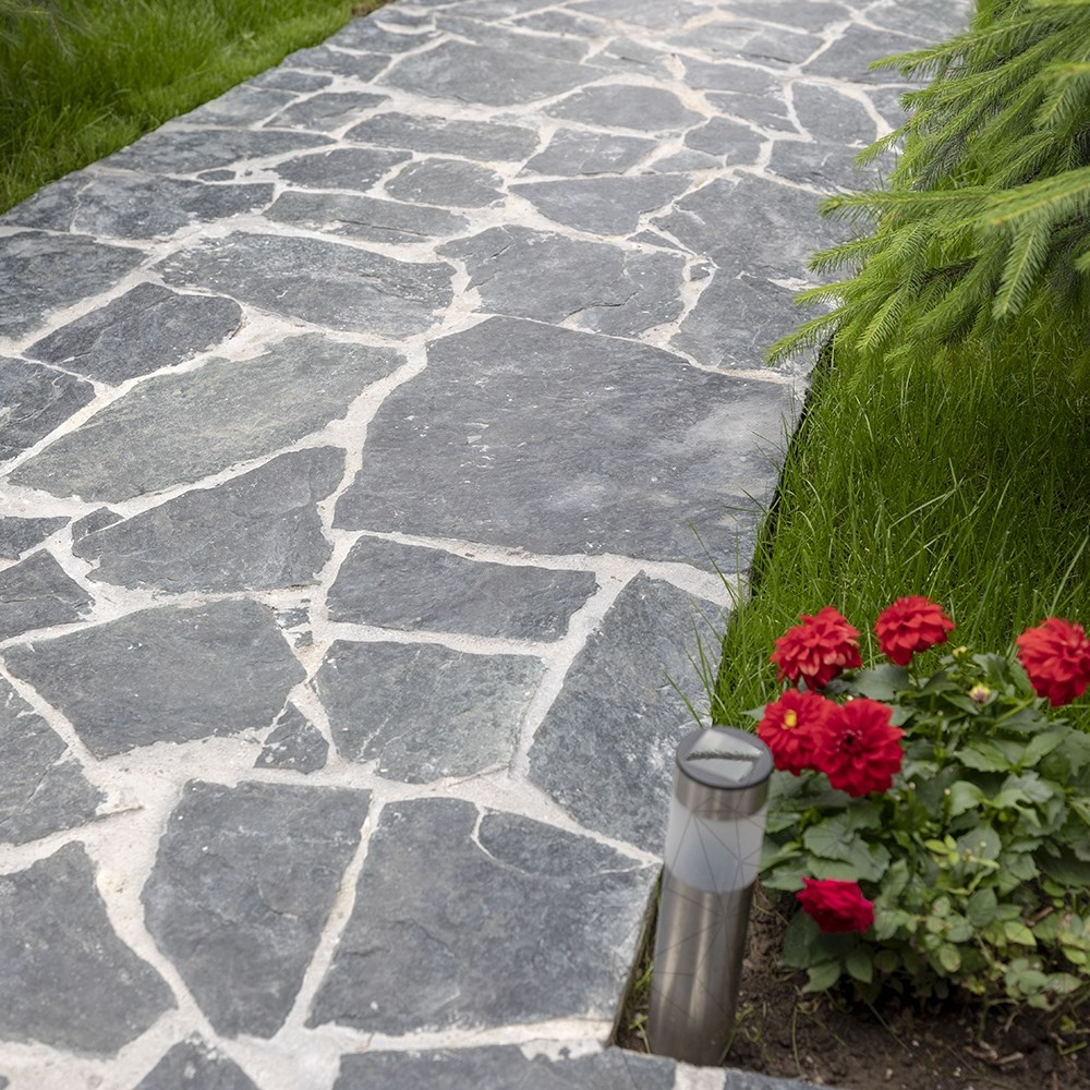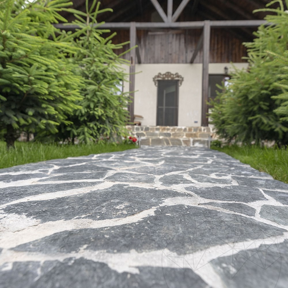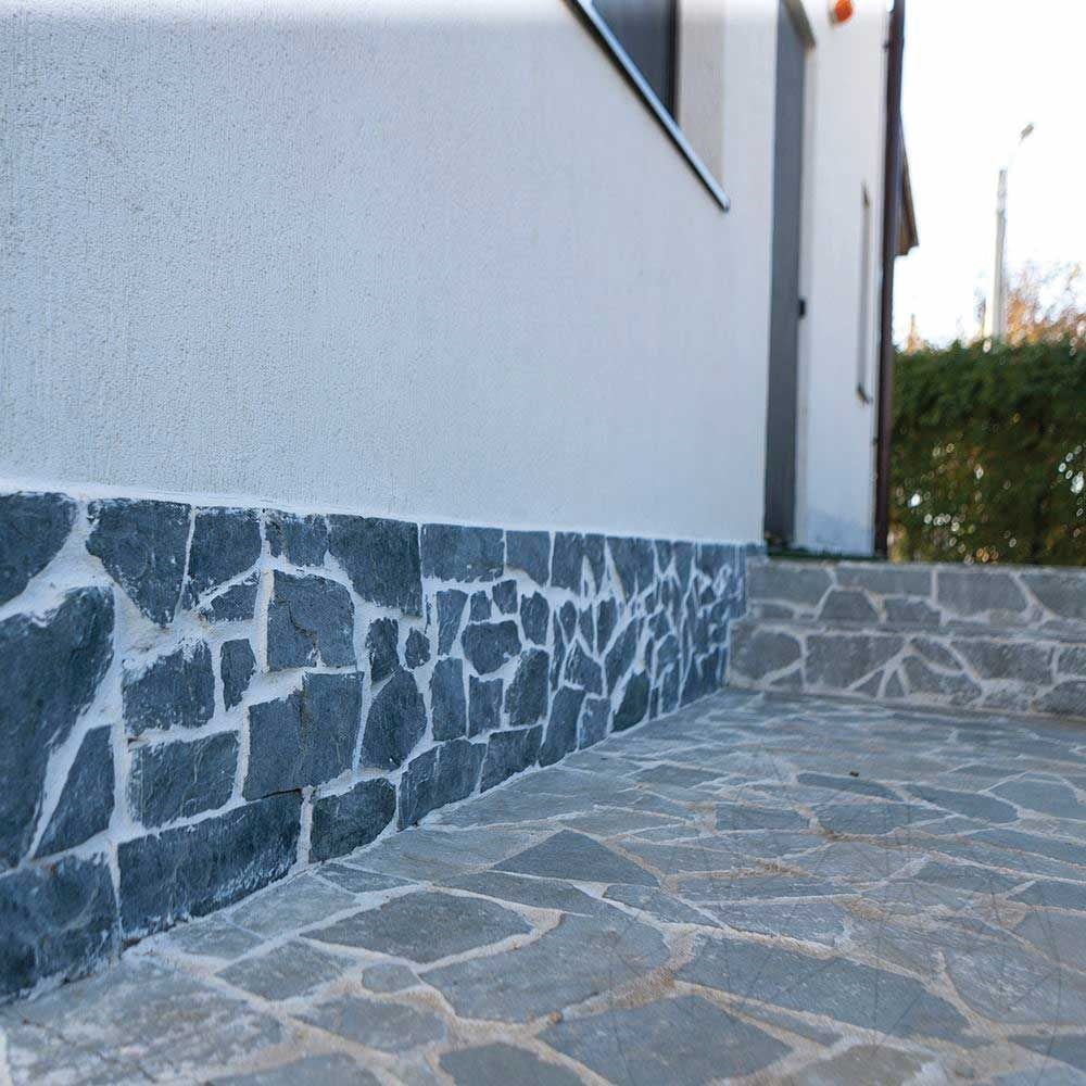 A perfect fit in garden decoration projects (such as walkways), Green Laguna natural slate offers an excellent solution even in vertical claddings for facades, embankments, fences and interior walls. The Green Laguna polygonal slate tiles are small and medium, therefore allowing for great composition freedom. The product is installed on an adhesive layer. Its medium color variations help create a uniform and relaxing look. It can be installed on an adhesive layer (vertically / horizontally) or on semi-wet screed (horizontally). This natural stone is not only robust, aesthetic and functional, but also highly freeze-thaw resistant.