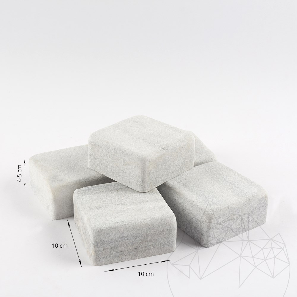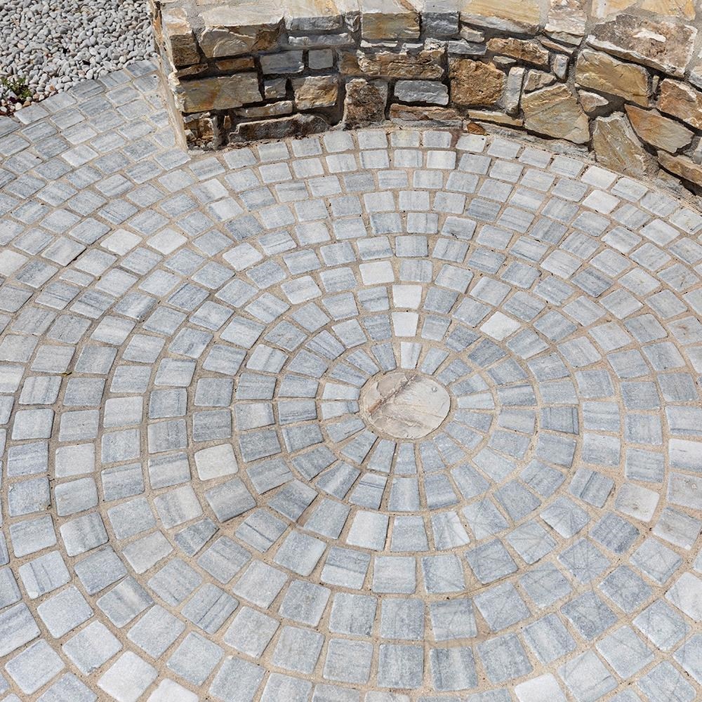 Unique exterior pavings made out cobblestone induce a sensation of balance and perfection to the admirer. With a high class aspect in various tones of white and grey, this Marble Kavala Tumbled (rounded edges) cobblestone can satisfy even the most pretentious individuals in terms of exterior pavings. It represents the ideal solution for creating pedestrian walkways, exterior terraces, garage entrances etc. If we talk about public domain arrangements, this marble cobblestone is also successfully used in building boulevards, parks, roundabouts, squares etc. The cubic stone is installed on a sand bed or a semi-wet screed, with or without grouts.