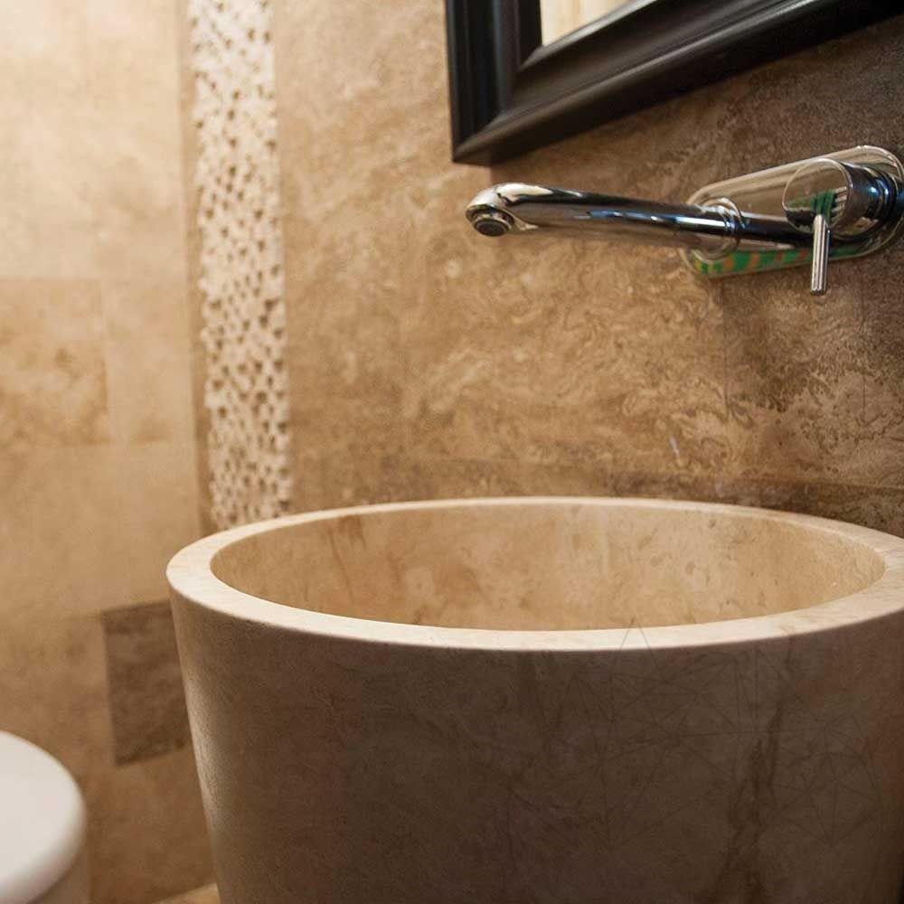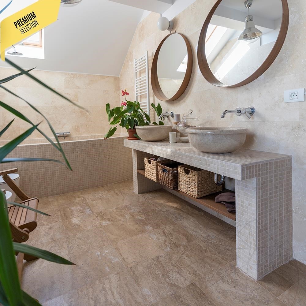 Today, the travertine represents the most natural choice, especially for the feeling of warmth which it emits, but also for its great color and matching possibilities. Having a refined appearance, the Latte honed travertine can be used for floorings, walls, fireplace claddings, embankments etc. This being the case, it can be met in bathrooms, kitchens, living rooms, passing hallways etc. At the exterior it is ued for cladding facades, home bases etc. These travertine tiles come already grouted and honed, making any room seem larger and more welcoming. For a better maintenance of the Latte honed travertine (30.5 x 30.5 x 1.2 cm), we recommend that the surface is treated with a sealant. It can be installed on screed, cement and thermal insulating system.