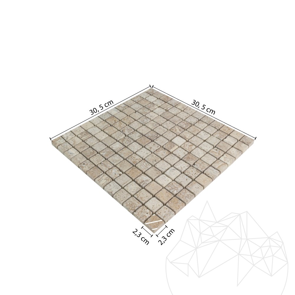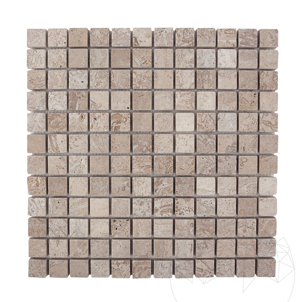 The Latte color, as part of interior design, in any environment brings a subtle sensation of relaxation and calm. Latte mosaic made of tumbled natural stone can be used in hallways, living rooms (on the wall behind the TV, for example), countertops, risers, etc. In exterior, this decorative natural stone, in its mosaic form, is often found in façade claddings, fences, poles, decorative frames etc. The Latte travertine mosaic has a tumbled finish, but small size (2.3 x 2.3 cm). It's a product that suggests delicacy and refinement, very suitable to create the illusion that the arranged space is larger than it really is.