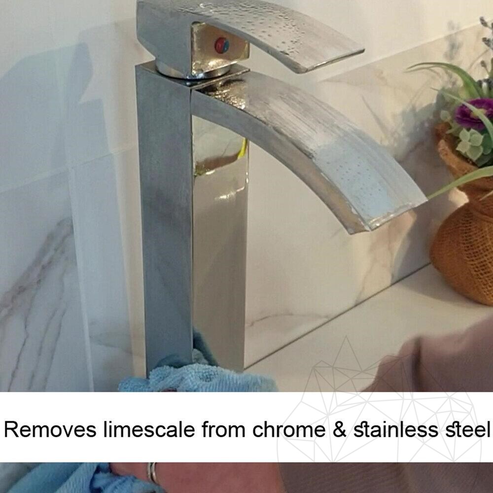 - For removing limescale residues: Spray the product on the affected surface and scrub with a black-handled sponge. Wipe with a microfiber cloth afterward.