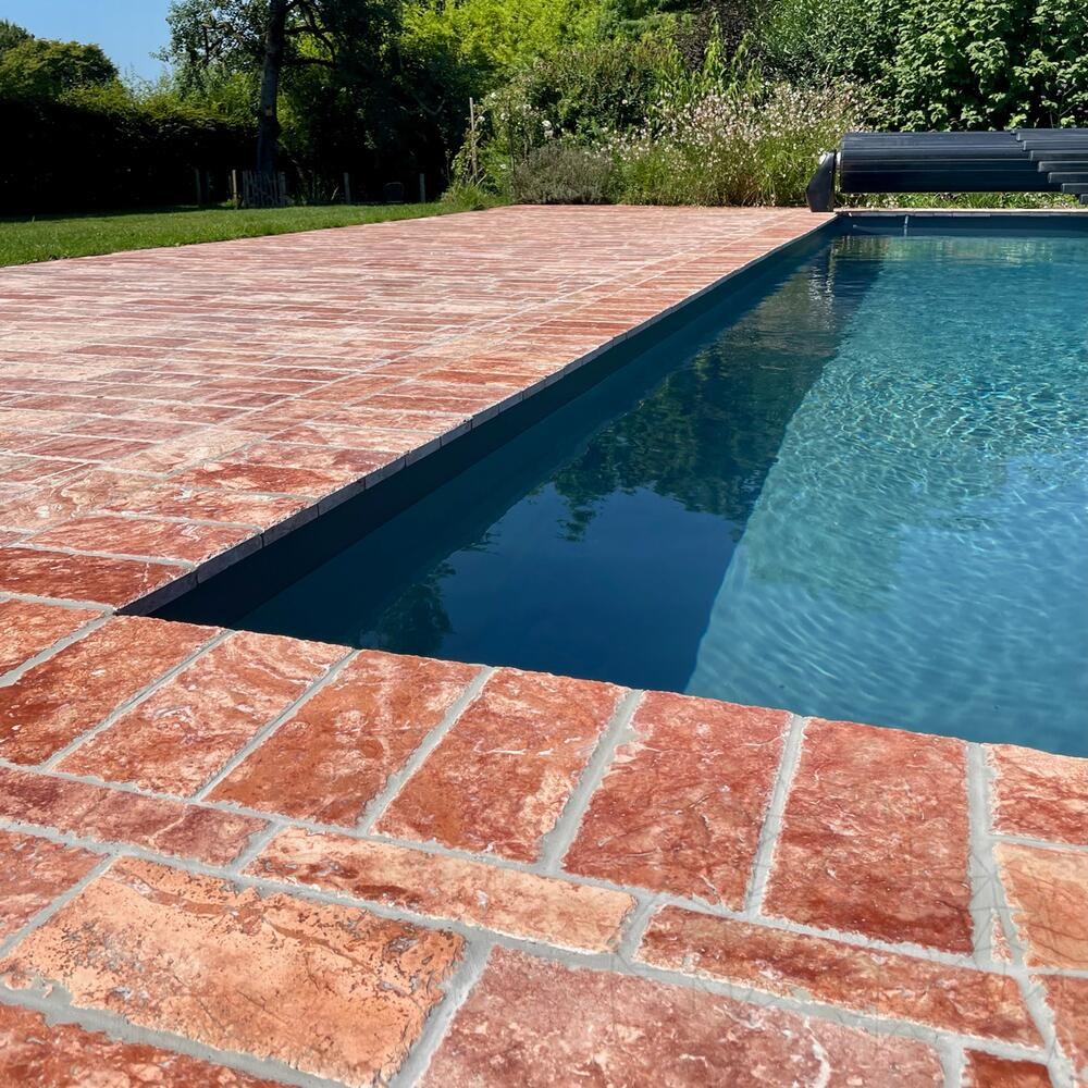 For exterior paving, Red OpiumCross Cut Travertine with brushed and chiseled finish is a daring material, defined by bold shades of light brown and cream Red Opium, ideal for any exterior decoration project, especially for medium traffic paving. The two finishes underline the veins and color variation that will help you obtain a unique space.