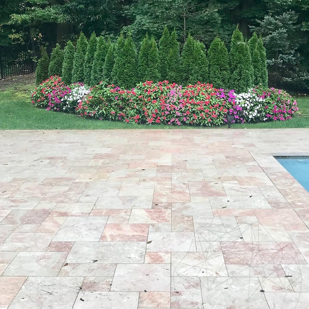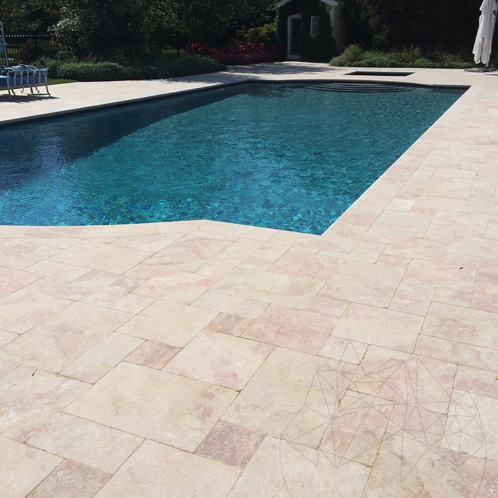 The 3 cm thickness doubles the standard stone hardness, thus making it suitable for paving areas with medium and heavy traffic, plus wet spaces (pool, etc.). Rosalina Tumbled Marble French Pattern Set 3 cm is recommended for both covered and uncovered terraces. Its beauty comes from a special color variation that makes every tile unique while shaping a perfect whole together.