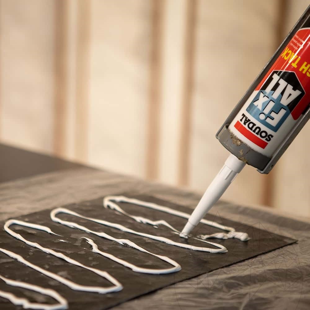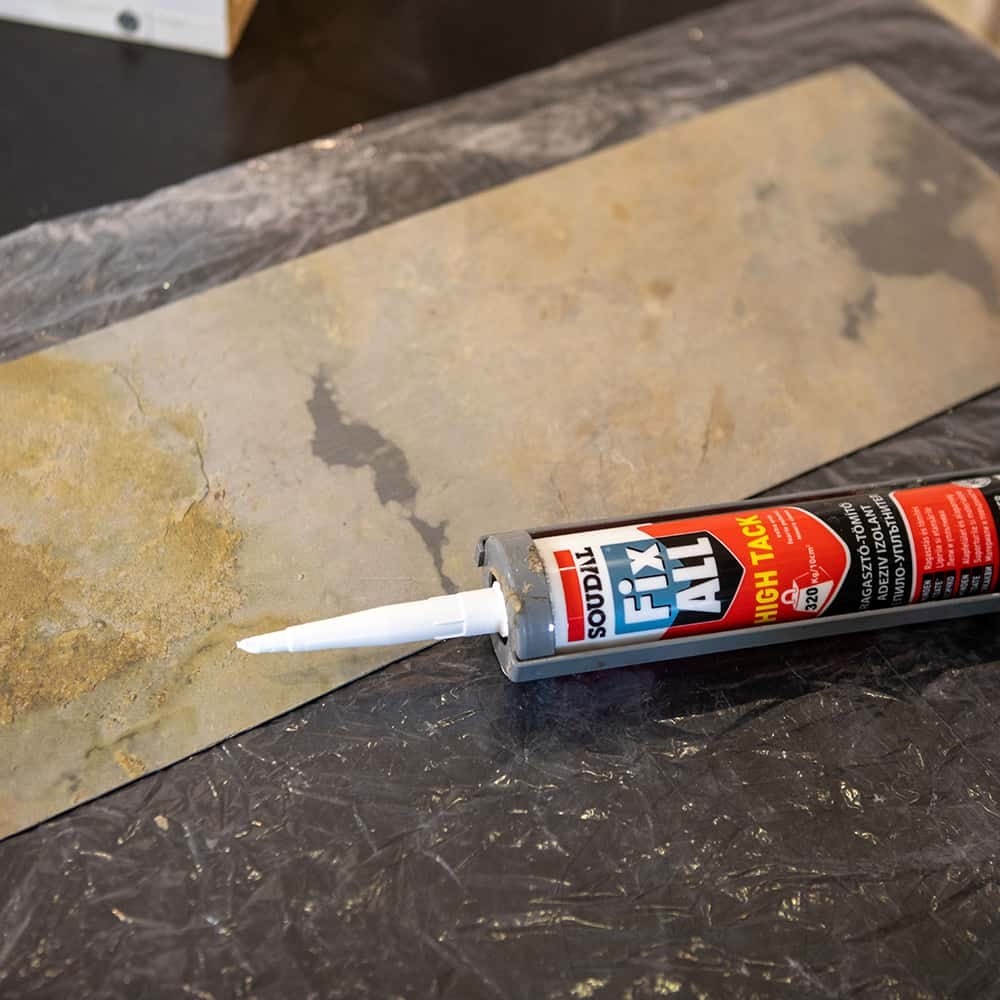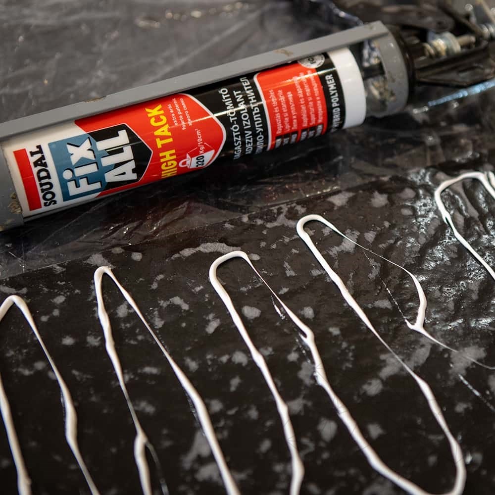 Soudal FIX ALL High Tack is a high-quality single component joint sealant with high adhesive strength, based on SMX® Hybrid Polymer Technology and recommended for bonding SKIN flexible slate over a clean, dust-free or grease-free substrate. With a paste-like texture, Soudal FIX ALL High Tack will form a film in 5 minutes and its curing time is 24 hours for a 3 mm coat. Moreover, this adhesive is water-resistant and also resistant to stains of grease, mineral oils, specific solvents and diluted acids, yet more sensitive to aromatic solvents (benzene, toluene, xylene etc.), hard acids and chlorinated hydrocarbons (TCE industrial solvent, chloroform, DDT insecticide, heptachlor etc.). Use a pneumatic caulking gun for applying adhesive and keep in mind that it is recommended for bonding and sealing a wide range of materials (except plastics such as polypropylene, polyethylene or TeflonTM)